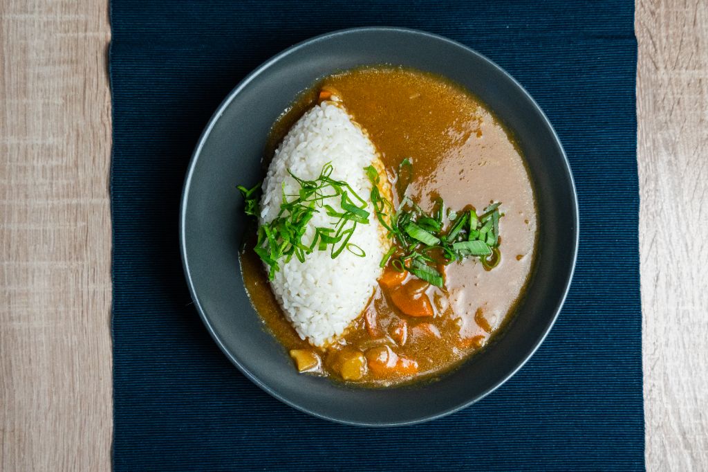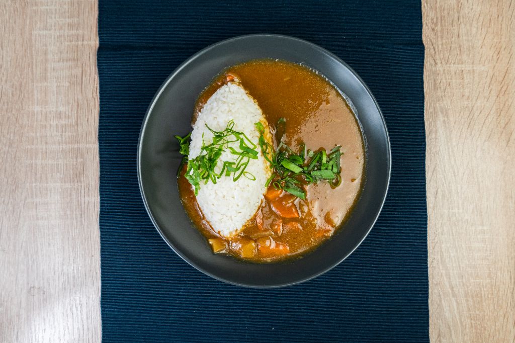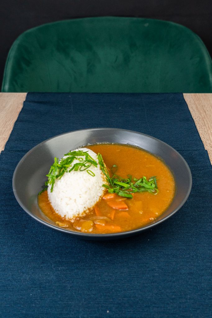 marchew / cebula / ziemniaki / cebula dymka / sos curry / ryż