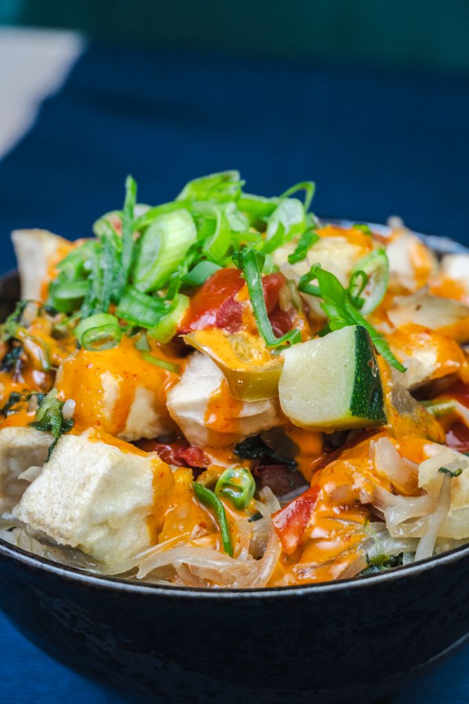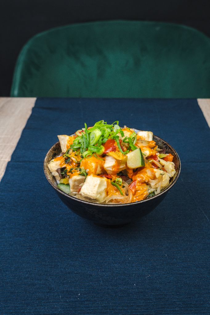 tofu / mąka / szpinak / Gochujang / pomidor / czerwona papryka / kiełki fasoli / cukinia / kiełki bambua / Sriracha Mayo / cebula dymka / ryż